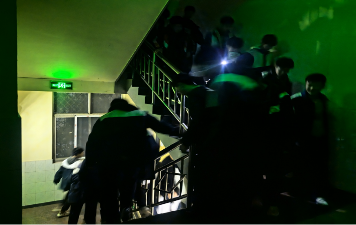 演练开始,寝室楼内警报器发出警报,生活老师立即拉响火警警报,各岗位人员迅速就位,指挥学生疏散。学生们听从老师指挥,用湿毛巾捂住口鼻,降低身体重心,弯腰快步沿楼梯依次而下,避免推搡和拥挤,按照预定的路线有序疏散至学校操场,各班老师清点人数并上报。