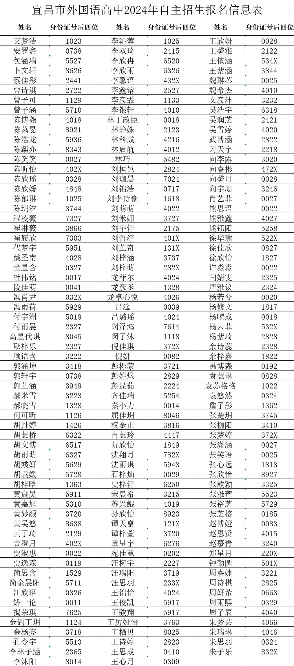 经审核,下列同学获得我校2024年自主招生考试资格,请考生携带打印的报名信息表和个人身份证明(身份证、中考准考证或户口本),于2024年6月25日上午8:00前到我校参加考试,考试时间6月25日9:00-11:00。