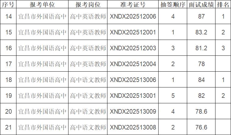 备注:根据《宜昌市2025年“招才兴业”教育系统事业单位人才引进校园招聘公告•西南大学站》要求,面试最低合格分数线为80分,对达不到最低合格分数线的,不能进入体检、考察阶段。