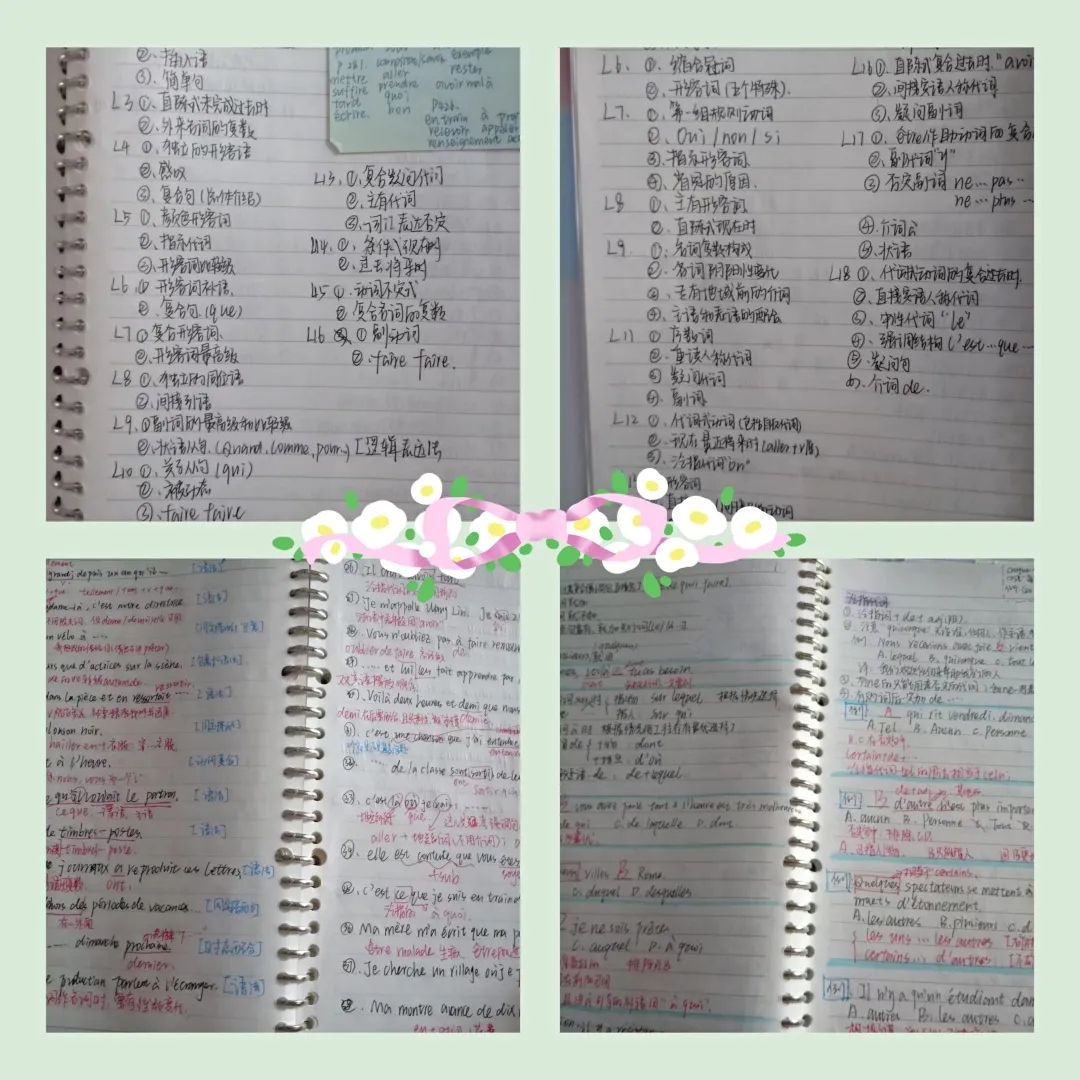 对于法语学习我也有以下几点看法:①掌握词汇(听说读写),多积累,多回顾;②知识点要熟悉,特别是语法框架,脑海中必须具备基本的语法思维导图;③有一定的逻辑思维能力和推理能力(如完形中联系上下文来做题);④多阅读法语美文,积累课外知识、优美句子;⑤做好听写本、抄写本的分类,以及笔记本和错题本的整理(考试前复习很重要);⑥课外多做题(如单选、完形、阅读、改错),勤练勤问勤思考,不仅可以查漏补缺,还可以锻炼做题速度。