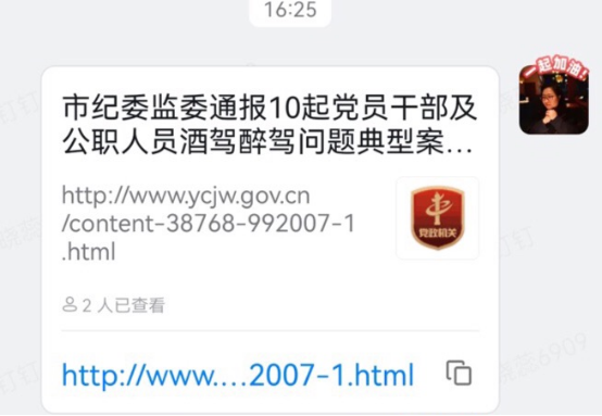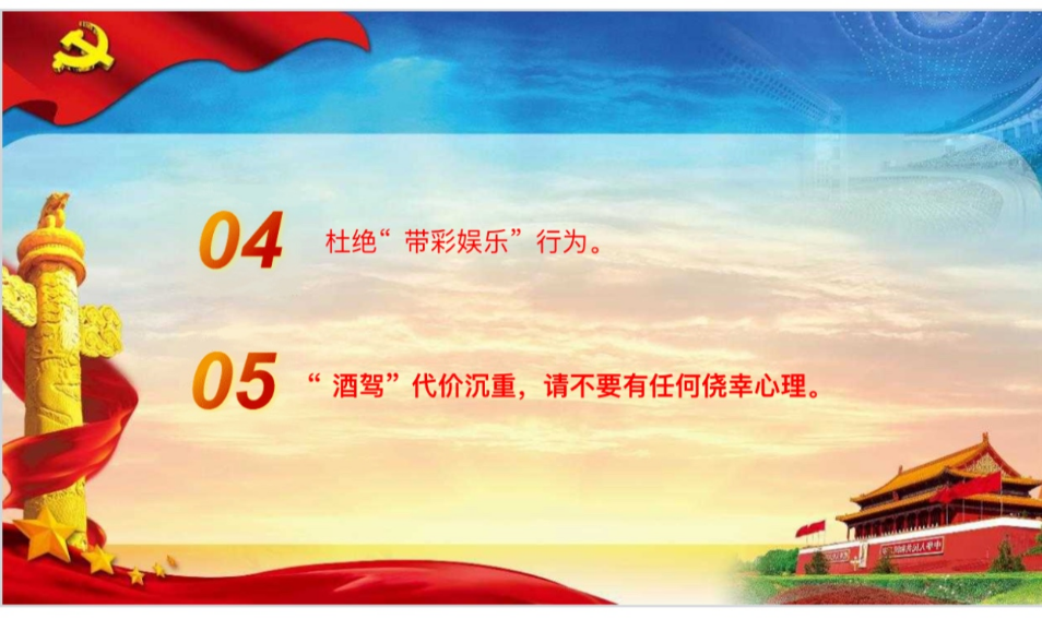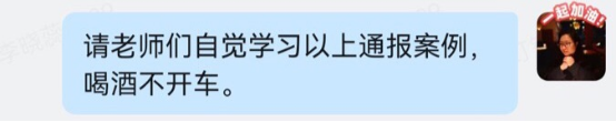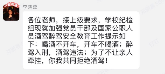 2021年9月16日,学校纪检委员李晓蕊在廉政党课上就已提出作为党员干部和公职人员要杜绝红线禁令,并重点对酒驾醉驾问题进行警示教育,让全体党员干部和公职人员从典型案例中深刻汲取教训,引以为戒。同时,通过工作钉钉群时刻提醒全体教职工要始终绷紧头上这根弦。