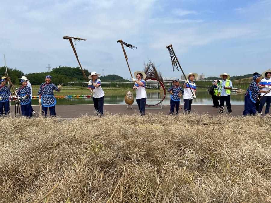 三峡日报讯(记者郑延)5月20日,市外国语高中的学生来到劳动教育基地——卷桥河湿地艺稼稻田区域开展“一日农夫体验,共享丰收喜悦”菜籽收割体验活动。