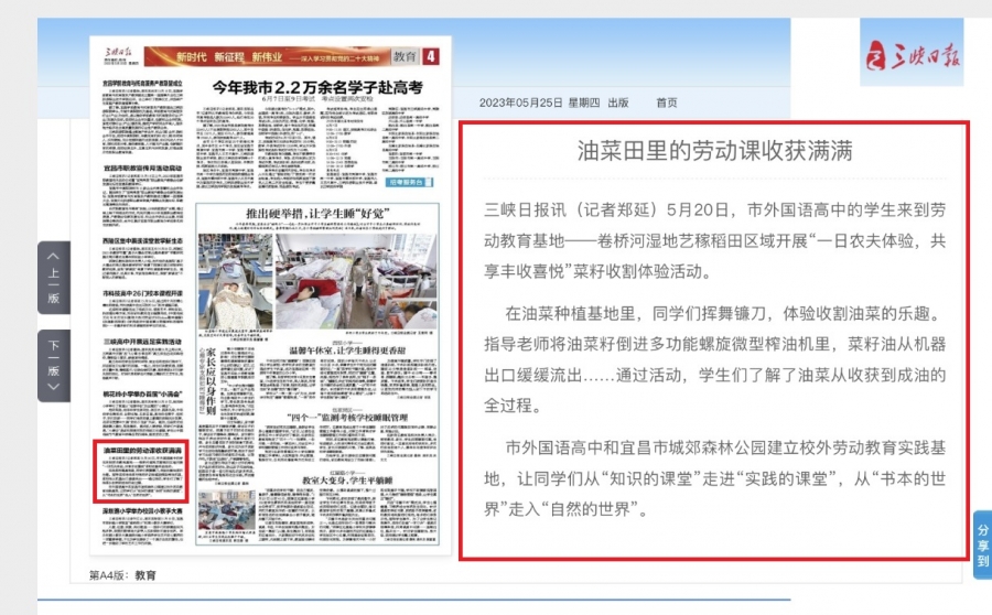 通过活动,学生们了解了油菜从收获到成油的全过程。市外国语高中和宜昌市城郊森林公园建立校外劳动教育实践基地,让同学们从“知识的课堂”走进“实践的课堂”,从“书本的世界”走入“自然的世界”。