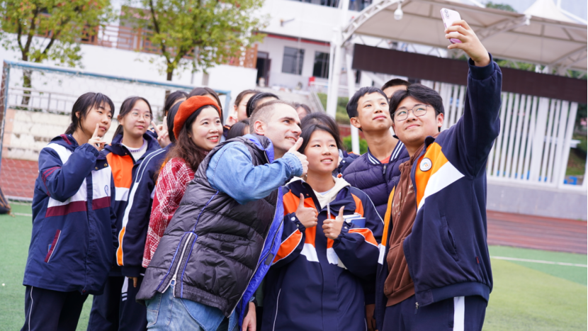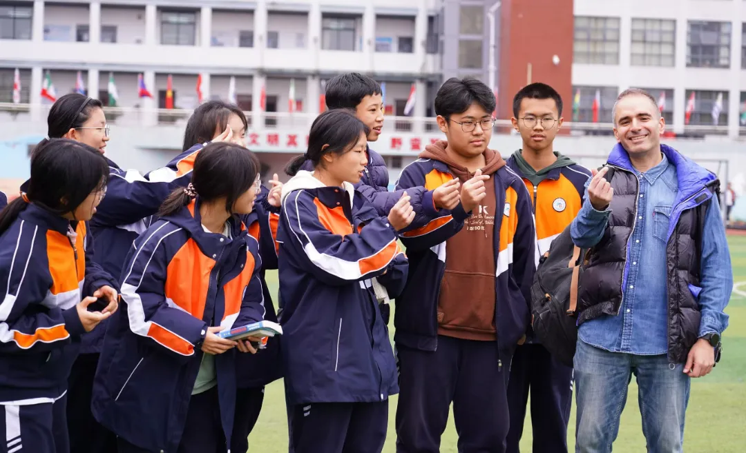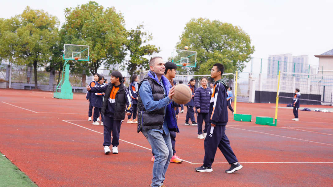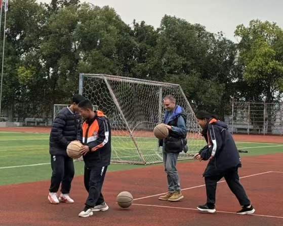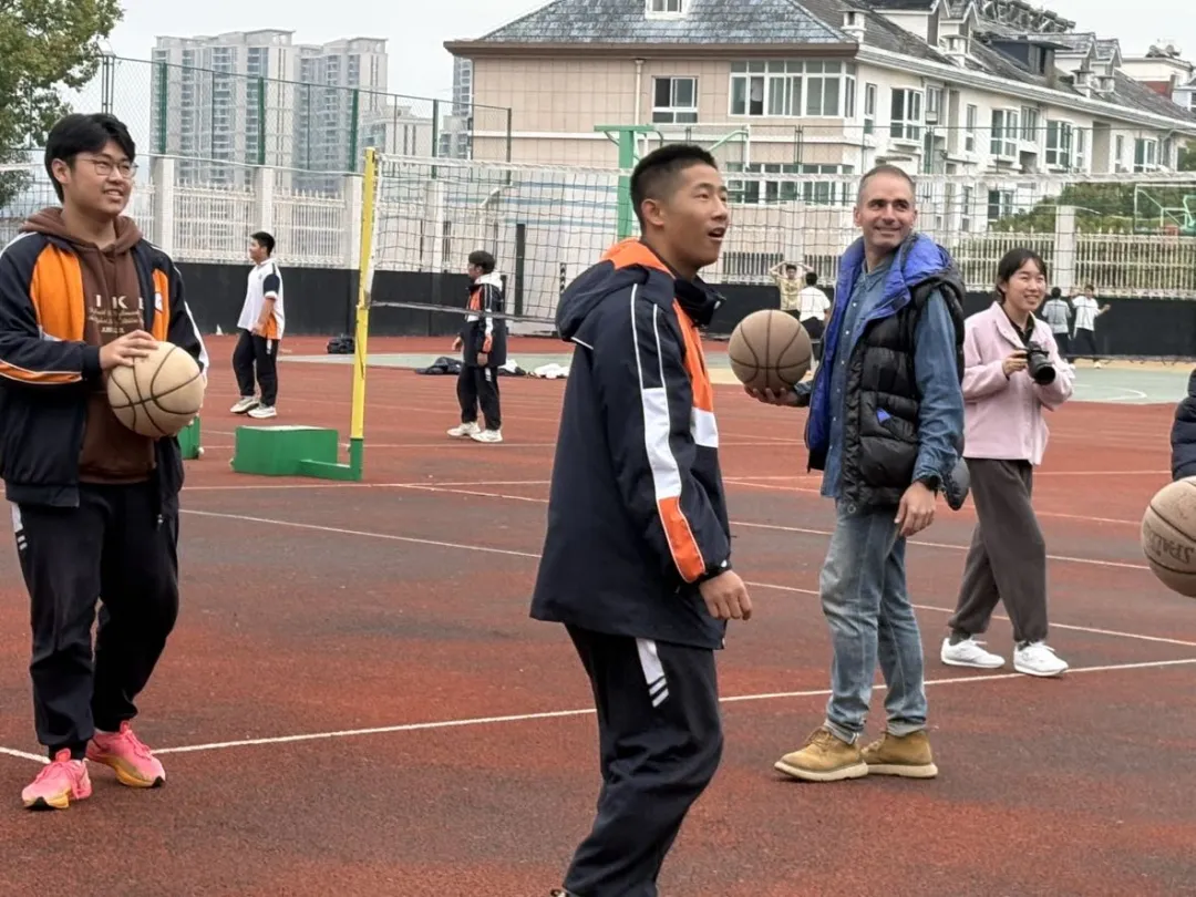在户外交流活动中,Carlos老师和我校学生进行定点投篮比赛。同学们在轻松愉快的氛围中,不仅锻炼了身体,还通过游戏感受到体育是超越语言和文化差异的通用语言,体会到体育活动在跨文化交流中的重要性。