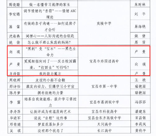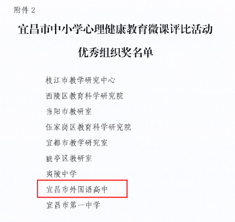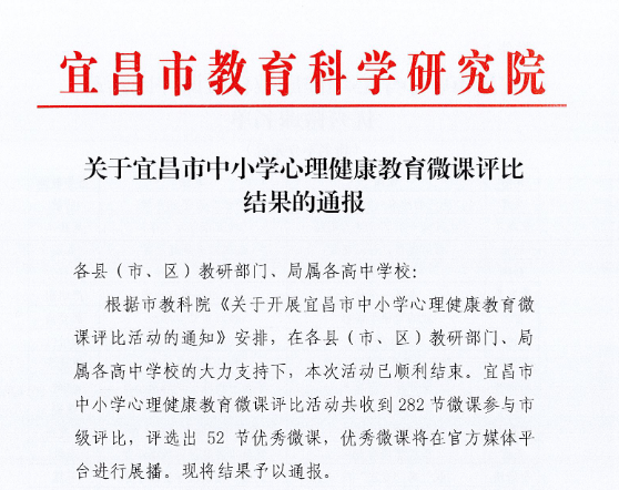 祝贺我校在宜昌市教育科学研究院组织开展的“宜昌市中小学心理健康教育微课评比活动”中荣获“优秀组织奖”!向瑛、卢曼、方玲丽三位教师的微课荣获“优秀微课”!优秀微课将在官方媒体平台进行展播,敬请期待!