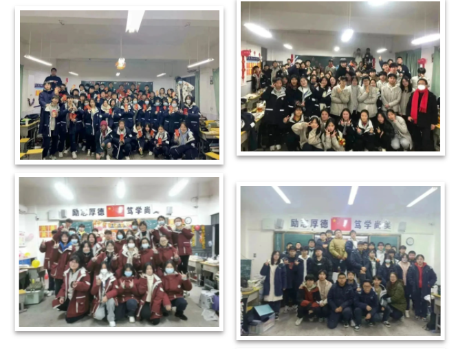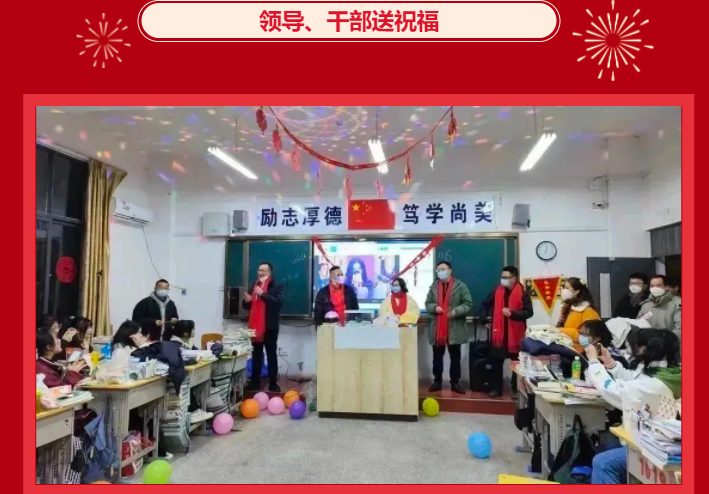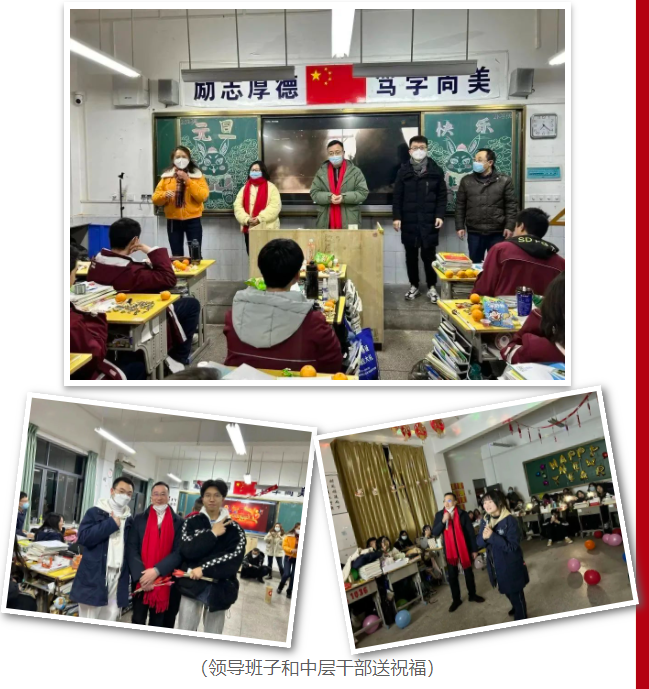 爱暖寒冬,情系学子。外国语高中校长黄文坚,学校党总支书记邹靖,副校长张晓维、李晓蕊、王明铸,工会主席张坤和中层干部带队深入每个教室,为全体同学送去最诚挚的新年祝福,让同学们感受到来自学校的深切关怀和温暖。