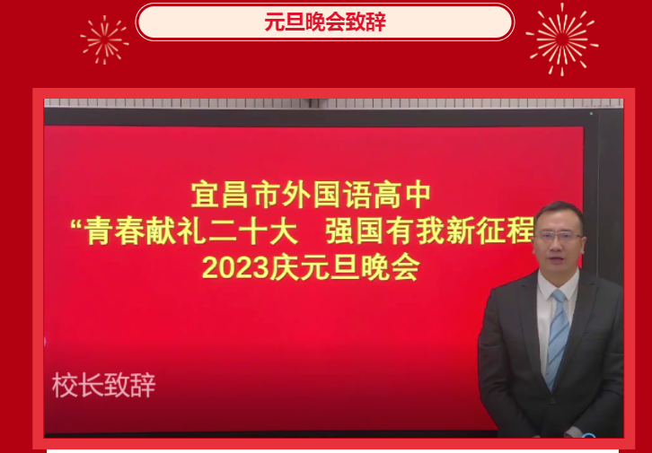 帷幕徐启,灯火璀璨,2023年正迎面而来。在这辞旧迎新的美好时刻,我们相聚在秀美江南,举行庆元旦迎新春文艺晚会。人人都有舞台,人人都是主角,今晚我们将又一次师生同台,尽展风采,同享欢乐,共祝未来!在此,我谨代表宜昌市外国语高中,向辛勤耕耘、默默奉献在教书育人一线的各位老师,向兢兢业业、埋头苦干在后勤保障工作岗位上的各位员工表示崇高的敬意!向砥砺奋发、追寻梦想的1090名同学们致以亲切的慰问!