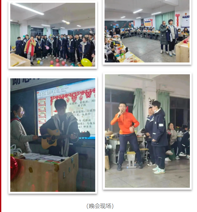 各班联欢晚会上,同学们热情高涨,积极参与,自编自导自演,充分发挥特长展示自我,表演自己的拿手节目,还邀请自己敬爱的老师们倾情合演。悠扬的歌声、铿锵的朗诵、飘逸的舞姿、欢快的小品,精彩的晚会点缀了冬季的外高校园,使整个校园充满了欢乐、祥和与温馨。