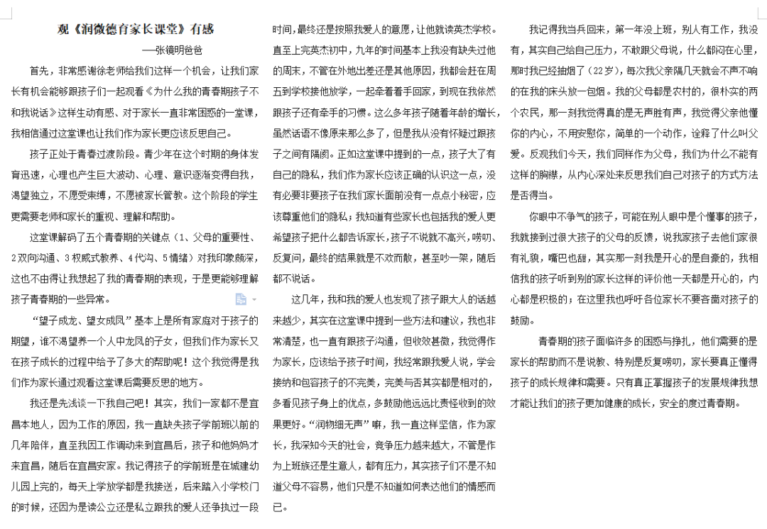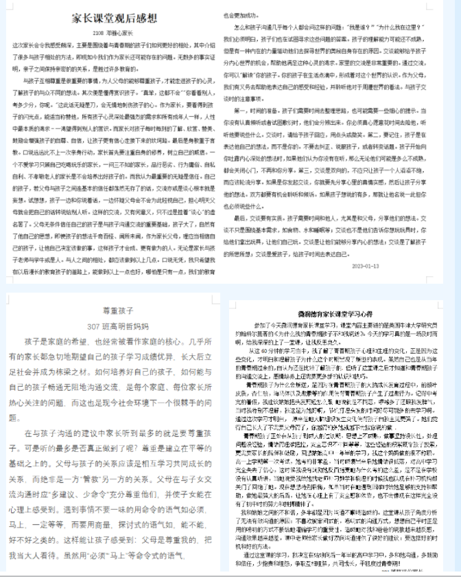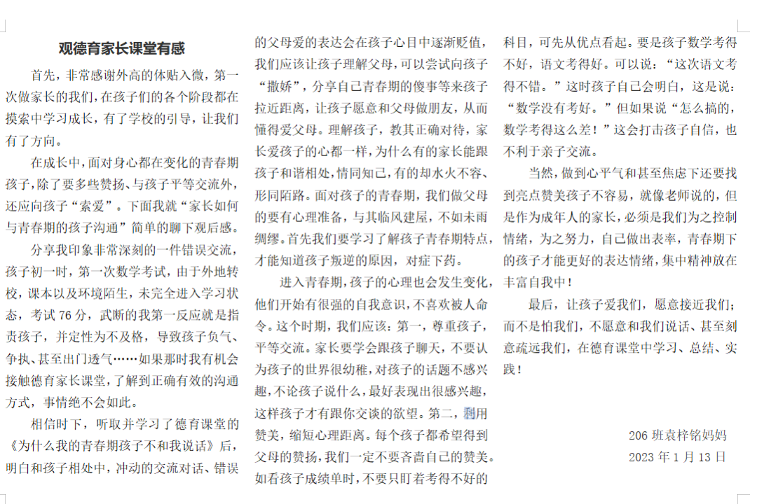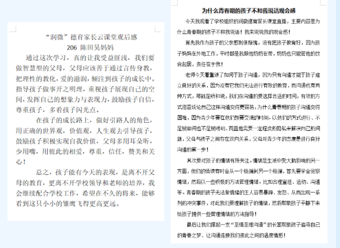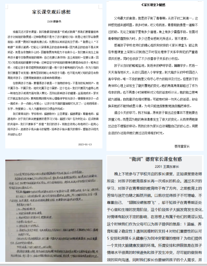 听完德育课堂,作为家长的我受益匪浅,心得体会中最关键的就是:家长特别要注意孩子身上一些细微的变化,运用正确的方法去帮助和教育好孩子,使之朝着健康向上的方向成长。——于静平家长