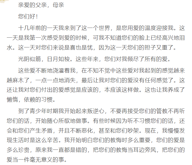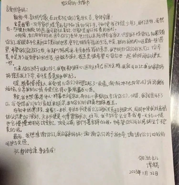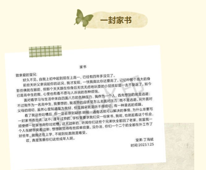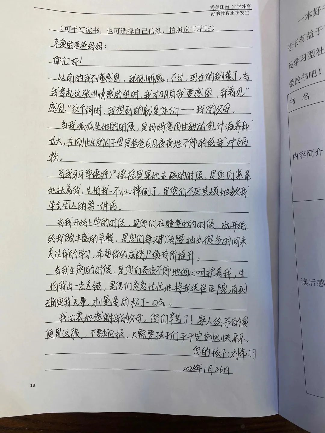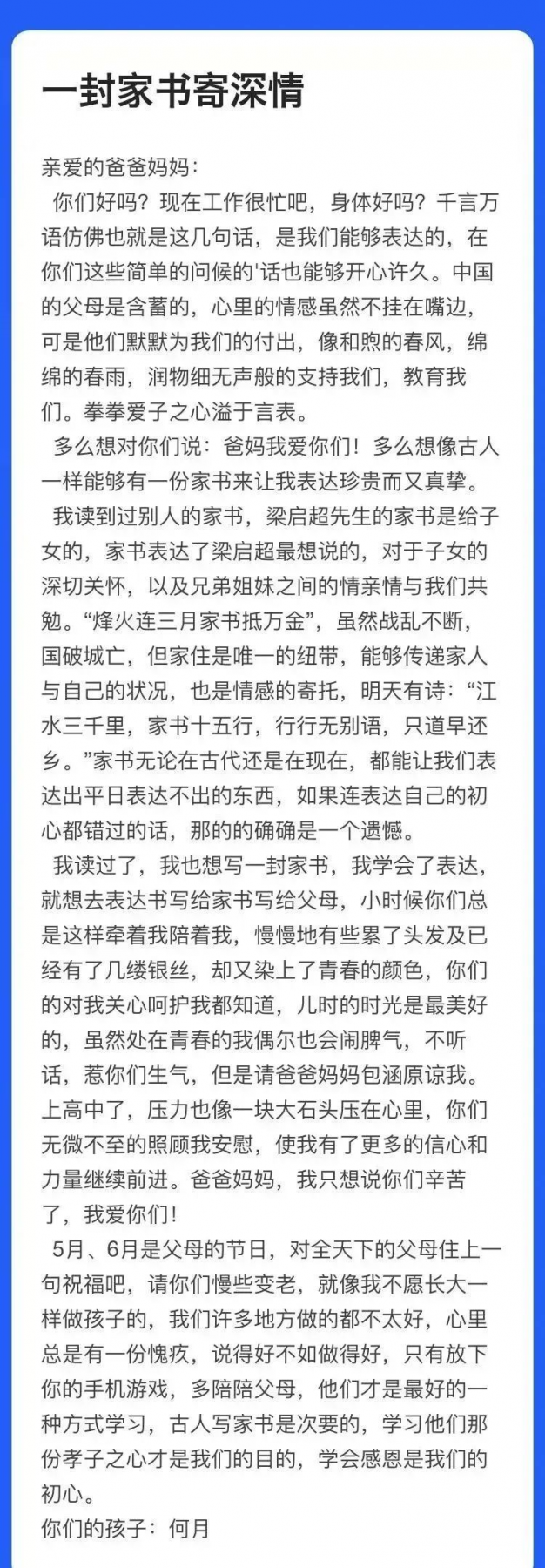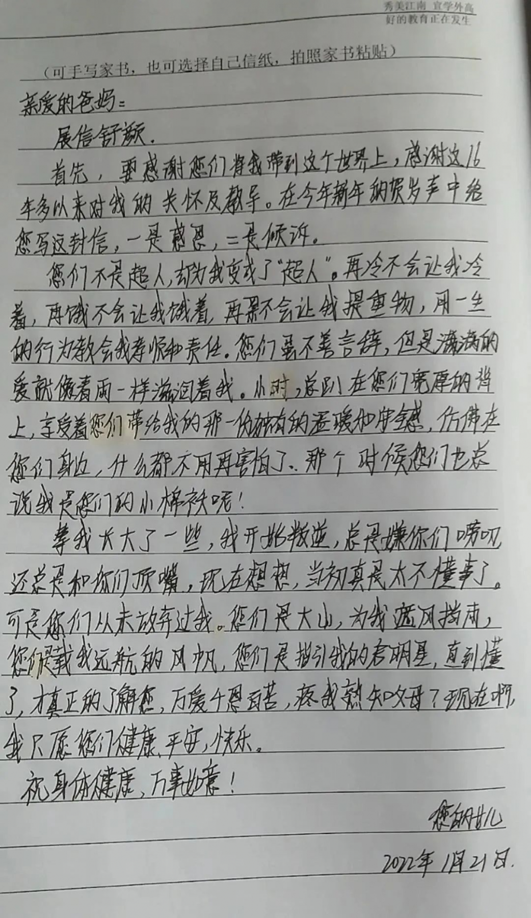 进入高中以来,孩子们长时间求学在外,与父母之间的交流越发减少,对于当下不善表达、习惯将情感安放于心底的学生而言,家书已经变得遥远。此次,我们重拾笔墨,利用家书和父母来一次亲切交谈,表露我们对父母的心声,让家书传递着我们对父母说不完的话语,道不完的思念。