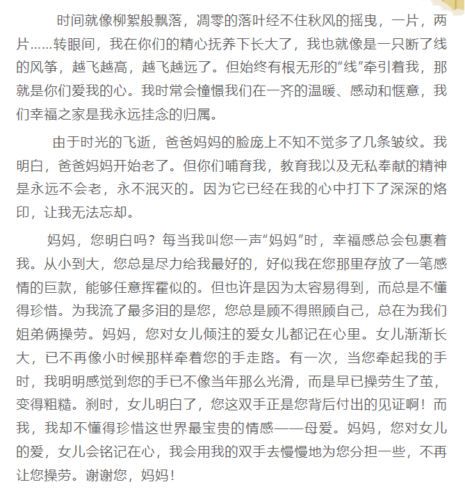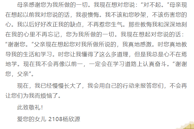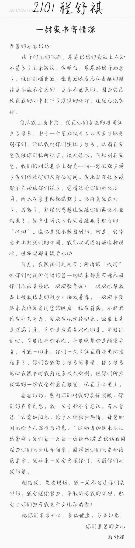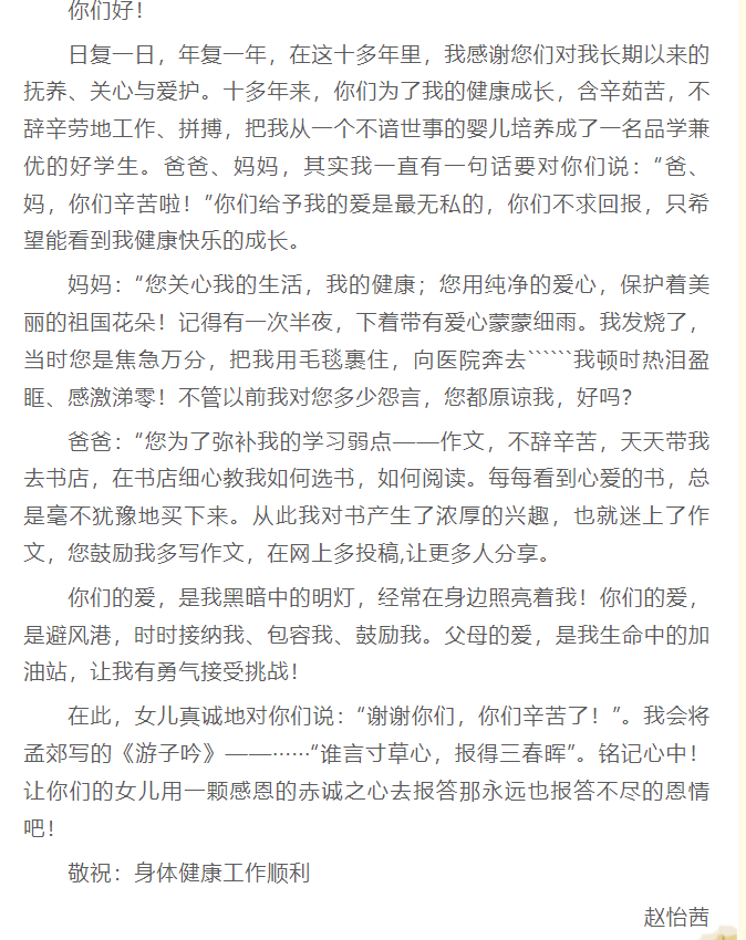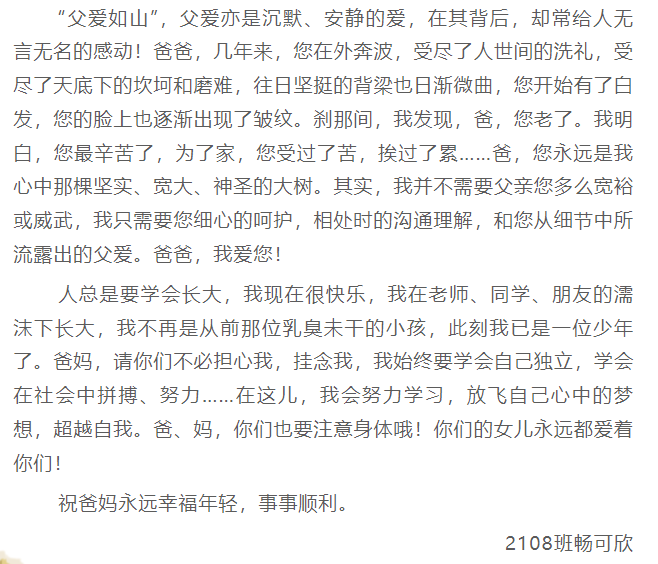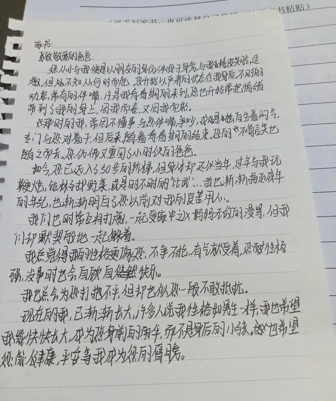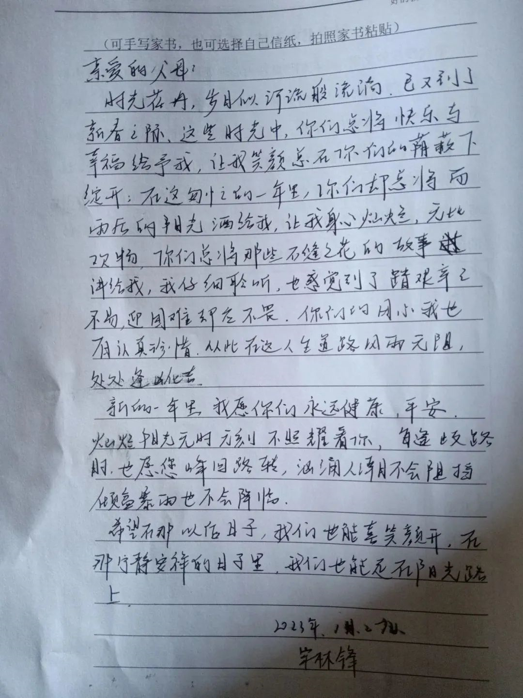 进入高中以来,孩子们长时间求学在外,与父母之间的交流越发减少,对于当下不善表达、习惯将情感安放于心底的学生而言,家书已经变得遥远。此次,我们重拾笔墨,利用家书和父母来一次亲切交谈,表露我们对父母的心声,让家书传递着我们对父母说不完的话语,道不完的思念。