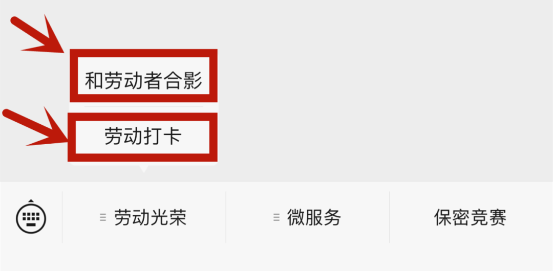 第二步,在底部菜单栏,点击“劳动打卡”,选择【和劳动者合影】或【劳动打卡】进入相应互动活动页面。