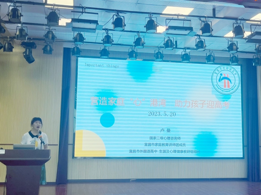 其次,学校心理老师卢曼面向全体高三家长做了一个主题为“营造家庭‘心’港湾 助力孩子迎高考”的心理培训。她从三个方面给了家长们科学实效的“陪考”建议:(一)放下内卷下的过高期待,提供坚实情感支持;(二)确保(家庭)生活正常化;(三)突发情况多准备,填报志愿早思考。