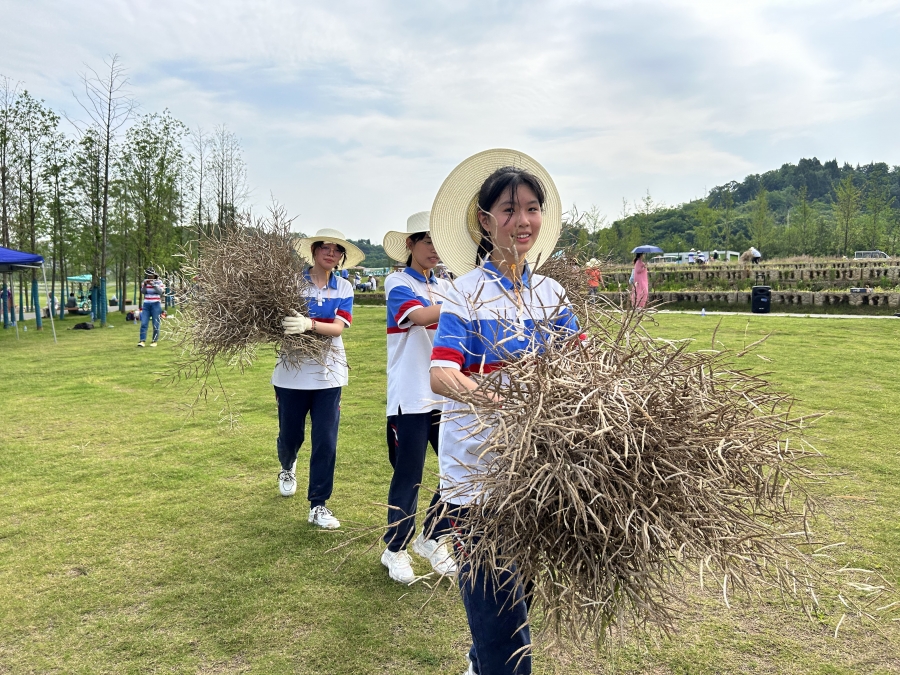 满目金黄香万里,一方春色醉千山。金黄的油菜花谢去之后,一粒粒菜籽粒在阳光雨露的滋润下变得越来越饱满。为引导学生回归大地,回归农田,营造崇尚劳动,劳动光荣的氛围,体验劳作,感受劳动的乐趣,2023年5月20日9:00,市外国语高中带领学生来到劳动教育基地---卷桥河湿地艺稼稻田区域开展“一日农夫体验,共享丰收喜悦”菜籽收割体验活动。