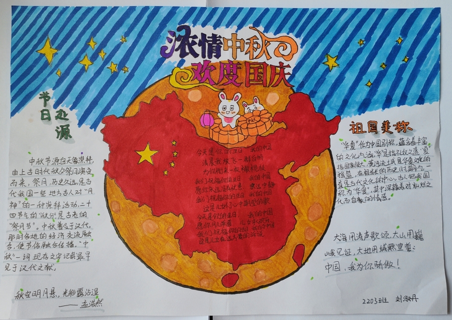 菊含黄金蕊,秋桂十里香。日月清明,鲜花着锦,我们迎来了祖国74华诞,外高学子们度过了一个快乐充实的中秋、国庆双节,并完成了假期德育实践活动作业,他们都在用自己的方式为伟大祖国献上深情的祝福。下面,让我们一起来欣赏同学们精彩纷呈的假期实践作业吧!
