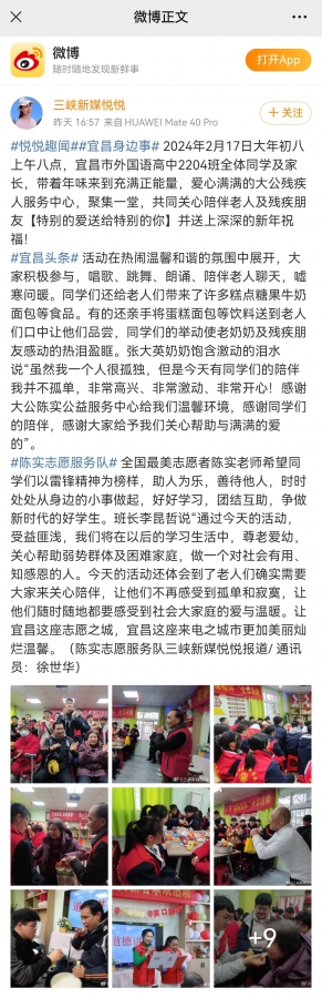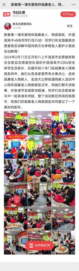 这个春节不打烊,宜昌外高的青年志愿者们寒假期间,用实际行动关心关爱老人,让孤寡老人残疾朋友们真切感受到来自社会的温暖,践行了奉献、友爱、互助、进步的志愿服务精神,同时也进一步激发了青年志愿者的社会责任感。同学们本次关爱老人及残疾朋友的志愿服务被今日头条、三峡新媒报道,得到社会层面的一致称赞。让我们也一起为他们点赞吧!