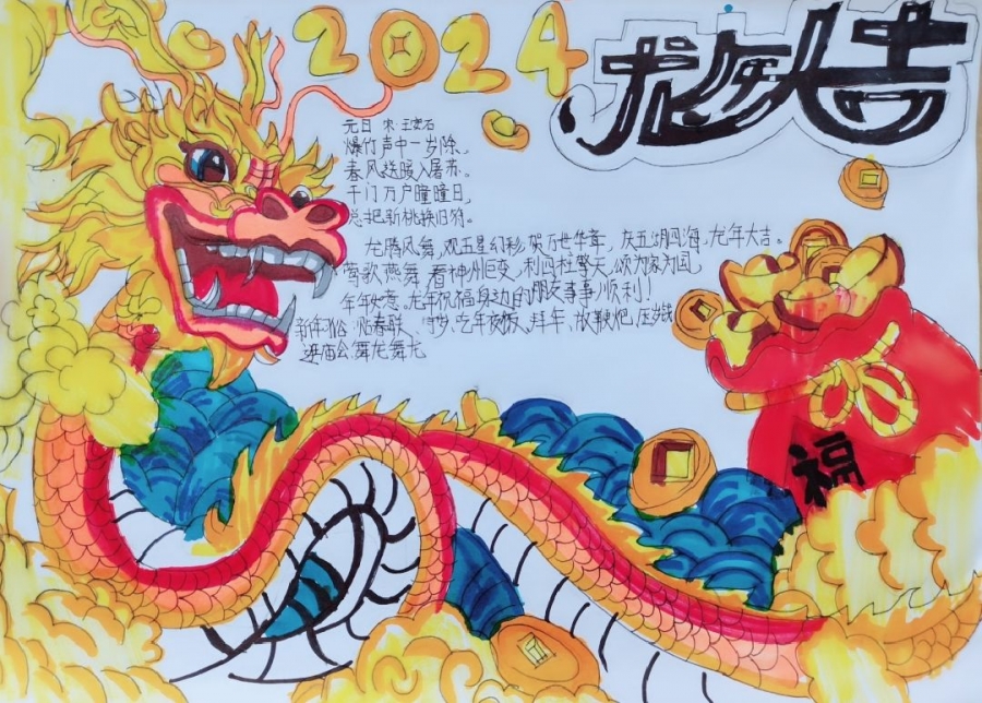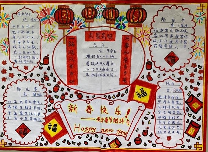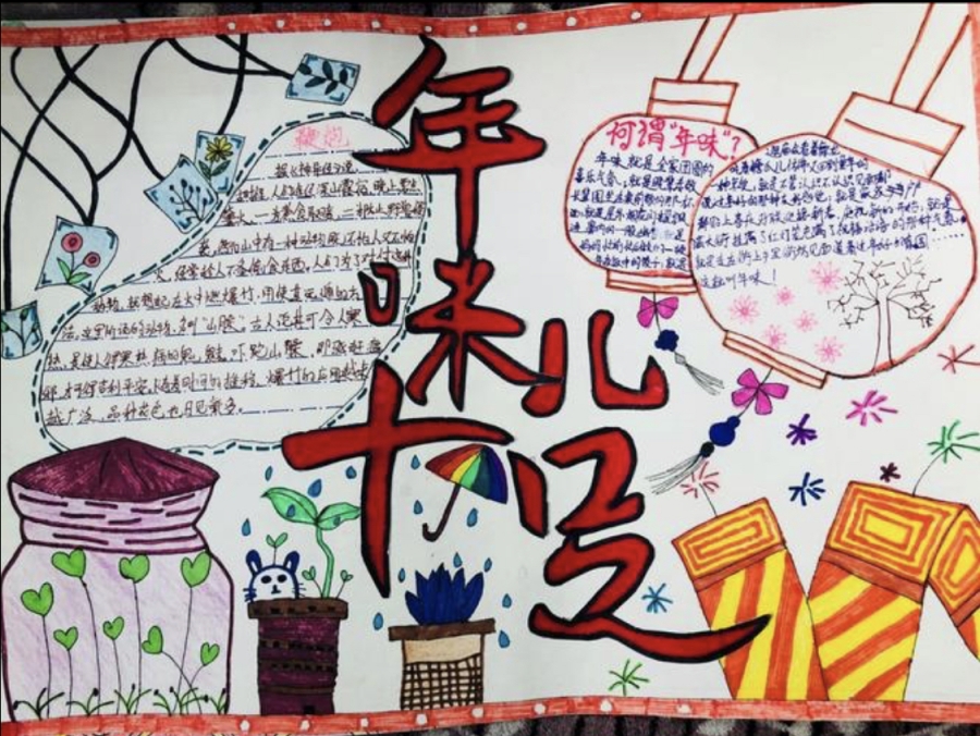 同学们广泛查阅资料,了解春节民俗文化知识,充分发挥自己的想象力和创造力,精心设计版面。恰当而有创意地配上了相应的插图、漫画,绘制出了一幅幅栩栩如生的精彩画报,让浓浓的年味跃然纸上。