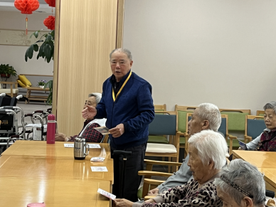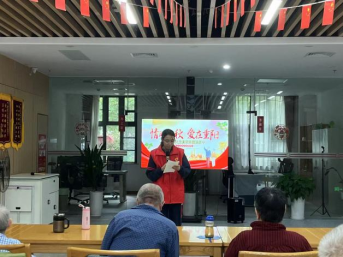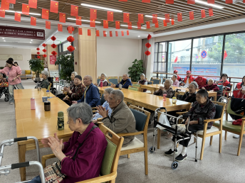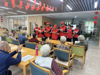 表演之后,进入了创意互动环节——击鼓传花。游戏开始时,整个养老院变成了欢乐的海洋,老人们和同学们的脸上洋溢着笑容,大家玩的非常开心。