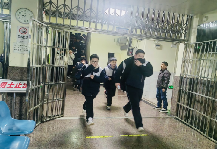 演练开始,寝室楼内警报器发出警报,生活老师立即拉响火警警报,各岗位人员迅速就位,指挥学生疏散。学生们听从老师指挥,用湿毛巾捂住口鼻,降低身体重心,弯腰快步沿楼梯依次而下,避免推搡和拥挤,按照预定的路线有序疏散至学校操场,各班老师清点人数并上报。