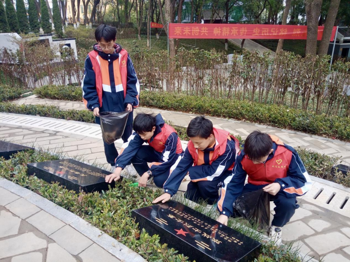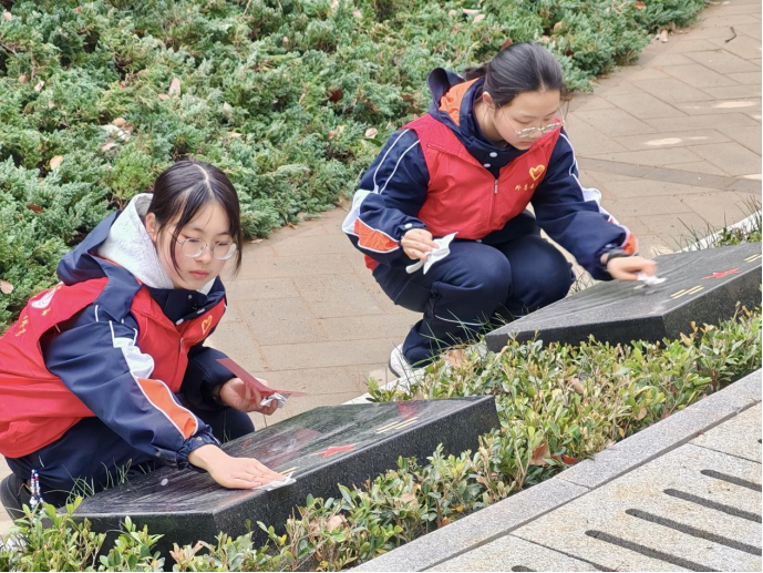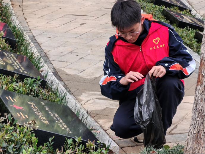 学生们分组擦拭墓碑,清理杂草。指尖触碰冰凉的碑石,目光凝视镌刻的名字,这不仅是劳动,更是对初心的擦拭。