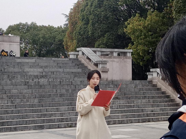 团委张菊老师致辞中深切缅怀长眠于东山烈士陵园的革命先烈,以“烈士陵园松柏长青,英雄精神永垂不朽”为结,呼吁同学们将先烈精神化为前行动力,将清明追思升华为爱国担当,共同守护热土、书写新时代壮丽诗篇。