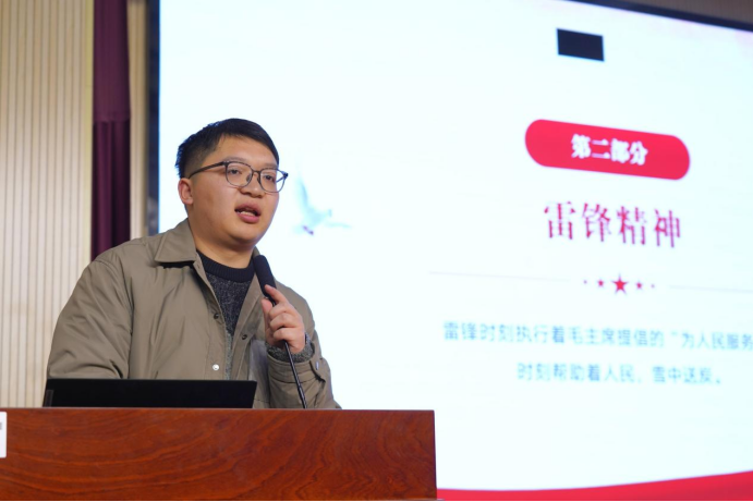 校党总支书记邹靖立足时代坐标,聚焦2025年两会,为学子擘画奋斗蓝图。他勉励青年以“学雷锋月”的公益之星为镜,对标国家战略需求,在科技创新中勇攀高峰,在社会实践中躬身力行,在文化传承中守正出新,将“小我”之志汇入“大我”洪流。最后,他以三句箴言赠予学子——“铸牢信仰之基,争当创新先锋,厚植为民情怀”,激励众人以青春之我书写无愧时代的华章。