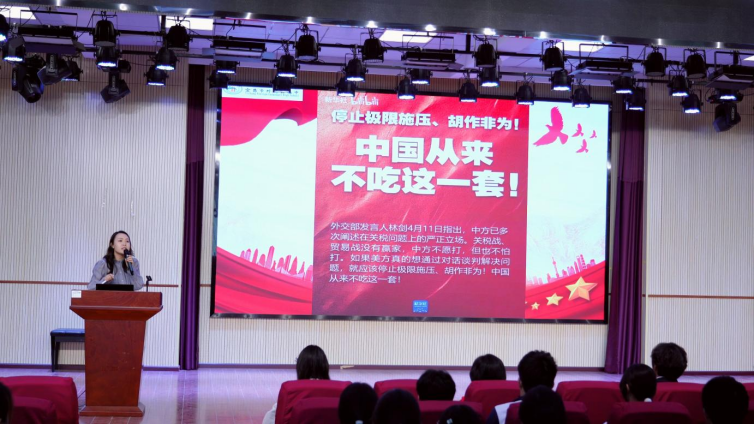 “美国的关税战,是经济博弈,更是思想之战!”赵伟校长以《丢掉幻想,准备斗争》为题,用历史与现实的交织,为青年学子拨开迷雾。他回溯抗美援朝的“钢铁意志”、华为突破封锁的“科技脊梁”,直指霸权逻辑的虚弱本质:“从‘纸老虎’到‘自我反噬’,时间终将站在真理一边!”