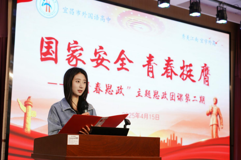 4月15日上午,宜昌市外国语高中六楼报告厅内,高一、高二全体共青团员齐聚一堂,共同开启“青春思政”第二期课程的庄严时刻。校团委干事田秋艳老师以铿锵之声拉开序幕:“国家安全是民族复兴的根基,更是青年一代的必答题!”从历史沉浮到时代挑战,从觉醒之志到强国之任,一场关于青春与守护的思政课正式启航。
