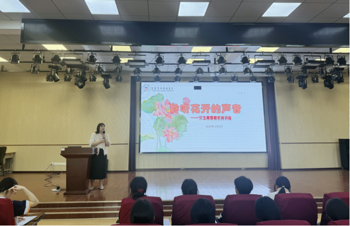 4月8日,宜昌市外国语高中全体高一年级女生在六楼会议室进行《聆听花开的声音》青春期心理讲座,讲座由学工处主任方玲丽老师主讲。