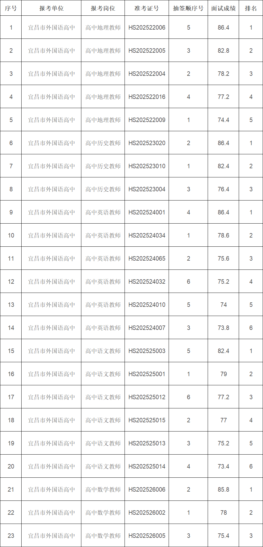 根据《宜昌市教育系统2024年及2025年“招才兴业”事业单位人才引进校园招聘公告•华中师范大学站》安排,现将宜昌市外国语高中2025年“招才兴业”人才引进各岗位面试成绩公告如下: