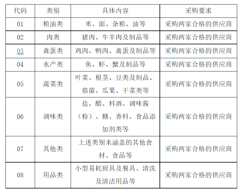 3、采购内容:采购食堂食材配送服务单位,负责宜昌市外国语高中食堂食材配送。配送服务内容包括但不限于粮油类、肉类、禽蛋类、水产类、蔬菜类、调味类、其他类、用品类等;同时还包括货物的供货、装卸、运输到指定地点及相关服务等。(详见文件第三章采购需求)