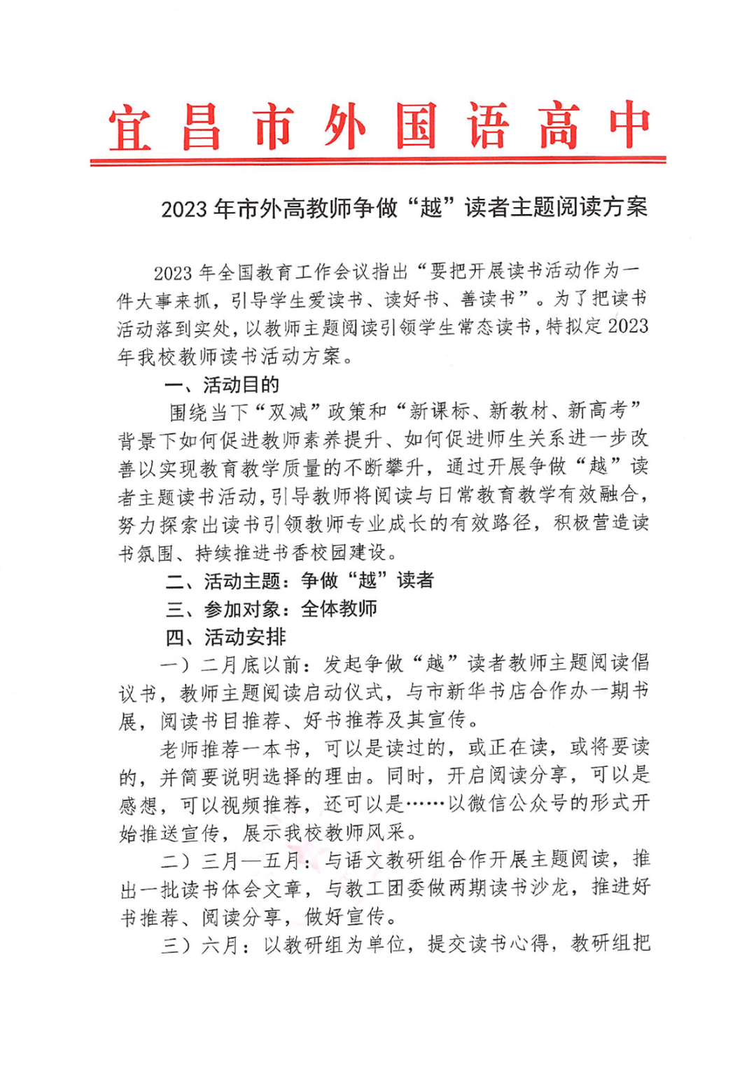 启动:发起争做“越”读者教师主题阅读倡议书,教师主题阅读启动仪式,与市新华书店合作办一期书展,阅读书目推荐、好书推荐及其宣传。