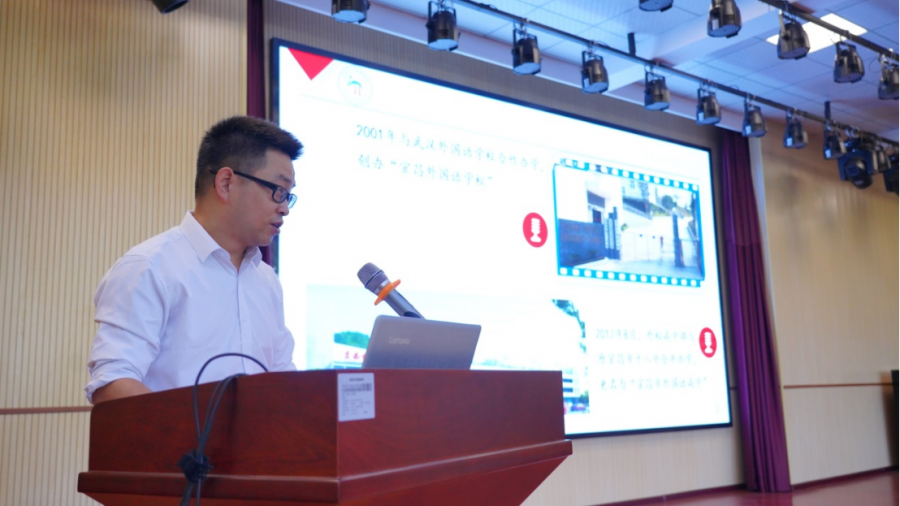 我校校长黄文坚致欢迎辞,黄校长代表外高全体师生员工热烈欢迎远道而来的河南省考察团各位成员,并介绍了外高的历史和人文。外高以“秀美江南,宜学外高”为口号,致力于“外语特色立校,各学科齐头并进”的办学目标,多年来为社会培养了大批拥有世界眼光、中国灵魂的复合型人才。黄文坚指出:“希望在未来外高能与桐柏各校达成更深层次的合作交流。推动两地教育的发展。”