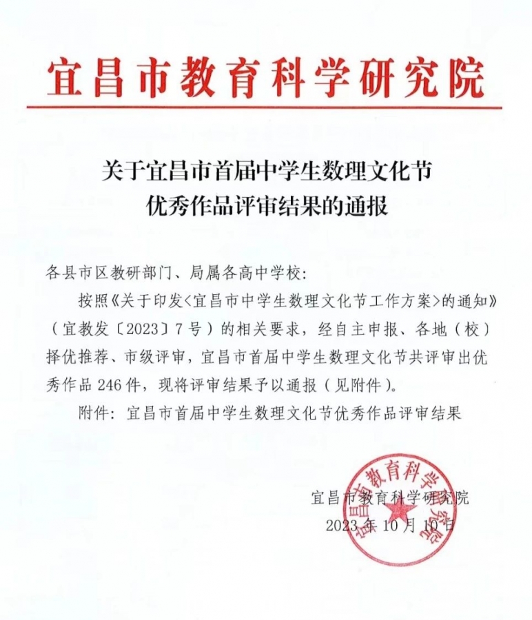 宜昌市首届中学生数理文化节优秀作品评审结果