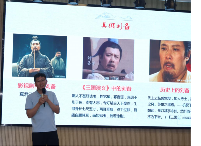 李征宇教授向同学们做题为《宜昌与三国历史变迁》的专题报告。他首先以分析“枭雄刘备”这一三国经典人物形象为导入,从影视剧、小说《三国演义》、《三国志》中“戏剧化”的刘备以及历史“真实的”刘备作对比,带领同学们走进三国这个金戈铁马、波澜壮阔,战争频繁,英雄辈出的时代。