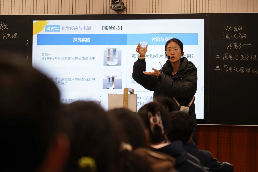青年教师“修远班”成员齐聚科技楼录播教室,观摩高一化学组张文婷老师的公开课《化学反应与电能》。张老师以“电能来源之谜”为切入点,巧妙结合生活案例与实验探究,带领2405班学生层层解密原电池的化学奥秘。
