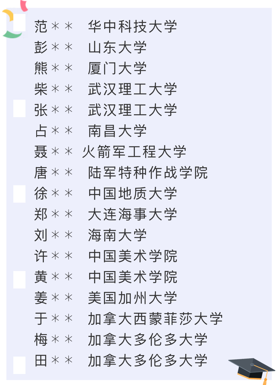 范✱✱ 华中科技大学 彭✱✱ 山东大学 熊✱✱ 厦门大学 柴✱✱ 武汉理工大学 张✱✱ 武汉理工大学 占✱✱ 南昌大学 聂✱✱ 火箭军工程大学 唐✱✱ 陆军特种作战学院 徐✱✱ 中国地质大学 郑✱✱ 大连海事大学 刘✱✱ 海南大学 许✱✱ 中国美术学院 黄✱✱ 中国美术学院 姜✱✱ 美国加州大学 于✱✱ 加拿大西蒙菲莎大学 梅✱✱ 加拿大多伦多大学 田✱✱ 加拿大多伦多大学