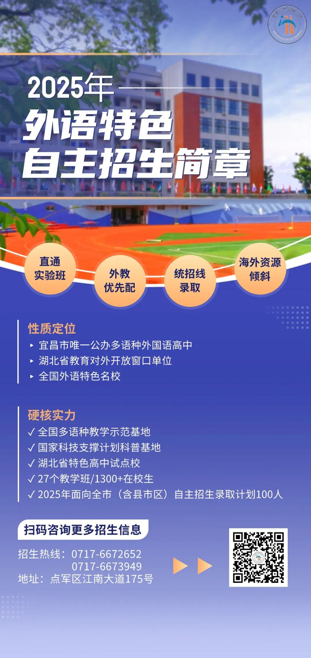 具体详情请关注宜昌市外国语高中官网和微信公众号上发布《宜昌市外国语高中2025年外语特色自主招生工作方案》