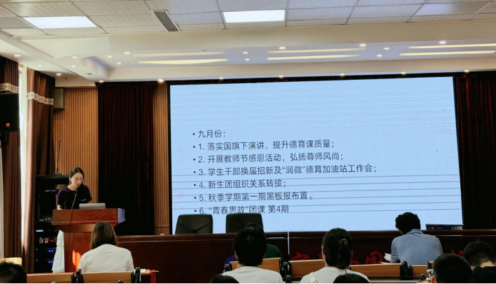 随后,团委副书记张菊老师以时间为轴,清晰梳理了本学期重点工作及活动安排。从月度主题活动策划到特色德育项目推进,每一项规划都紧扣学生成长需求,旨在通过丰富多样的活动载体,让德育融入学生日常,助力学生在实践中提升综合素养。