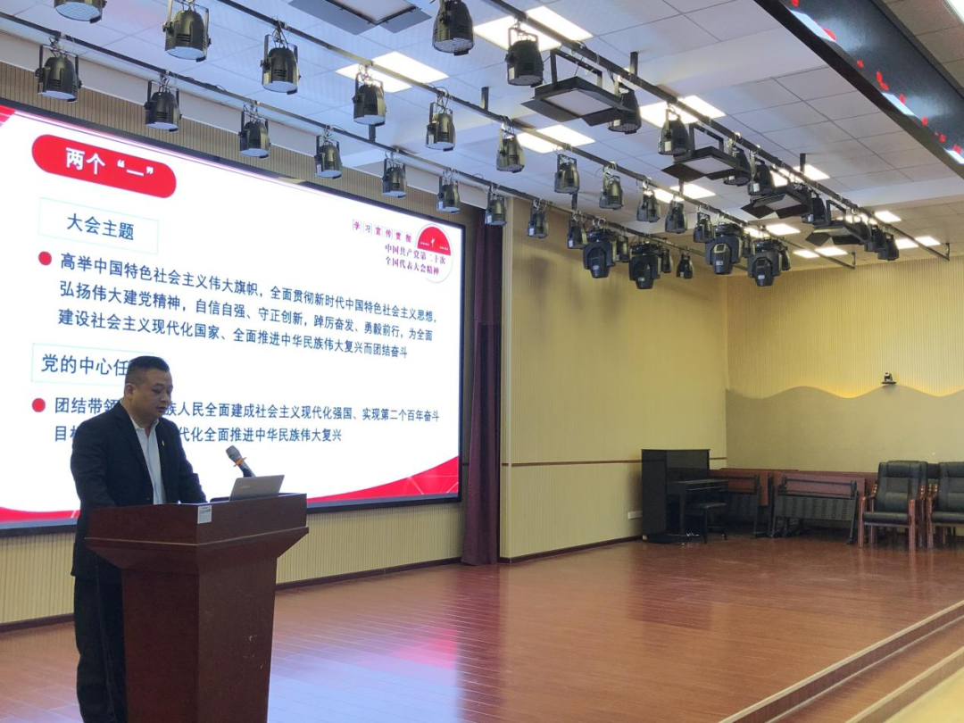 会上,学校党总支书记邹靖以《以中国式现代化全面推进中华民族伟大复兴——深入学习贯彻党的二十大精神》为主题讲党课,重点围绕五个方面的内容进行讲解:一是新时代十年伟大变革具有里程碑意义;二是推进马克思主义中国化时代化;三是以中国式现代化全面推进中华民族伟大复兴;四是加快构建新发展格局,着力推进高质量发展;五是二十大报告关于教育的重要论述。邹靖要求全体党员教师能够明确教育是国之大计,党之大计,育人的根本在于立德,全面贯彻党的教育方针,落实立德树人根本任务,培养德智体美劳全面发展的社会主义建设者和接班人是全体教师的职责所在。
